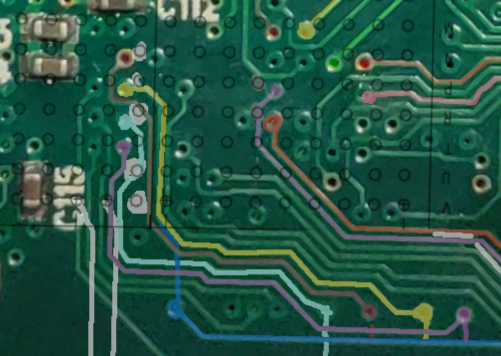 I created a nice new layer with some transparency and started highlighting the surrounding tracks. But hey, they are going into vias! I hope this design does not have signals in internal layers so I can catch them back on the top layer.