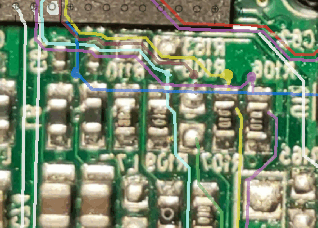 For the purple track, since it was not visible all the way long, I used the multimeter in continuity mode. After reaching R106, it is indeed going to the connector, but it is hidden by the D21 overlay marking.