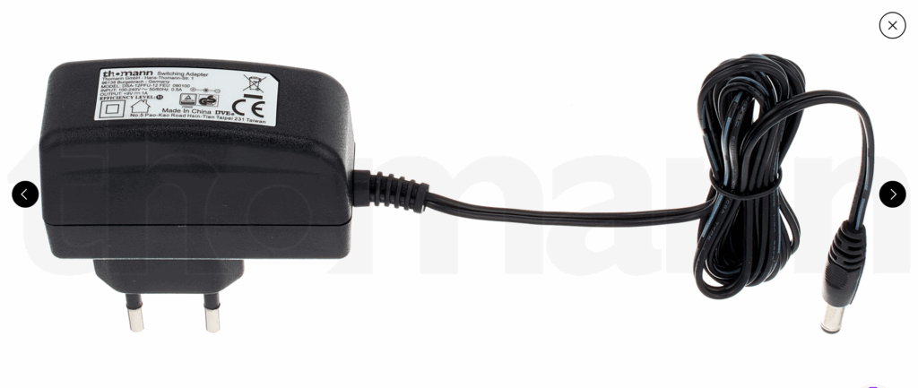 In the music gear world, the standard power supply is DC 9V over a 5.5mm / 2.1mm barrel jack… but beware, because the barred jack is connected with the + outside of the barrel and the – inside!